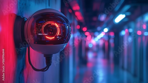 © dewpra, Fototapeta premium Futuristic Surveillance: A high-tech security camera in a neon-lit environment