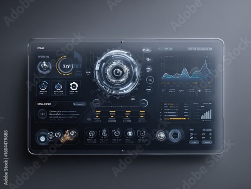 © Freedom in Life, Fototapeta premium Futuristic tablet display shows holographic interface with data charts and graphs on a dark background
