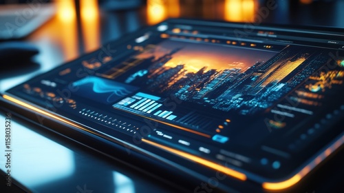 Fototapeta premium Futuristic tablet displaying city skyline and data analytics.
