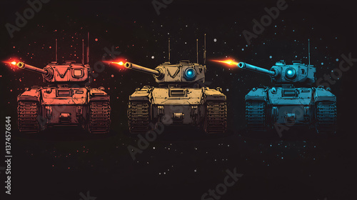 Fototapeta premium Futuristic Tank Squadron: Neon-Colored Digital Art Showcasing Powerful Combat...