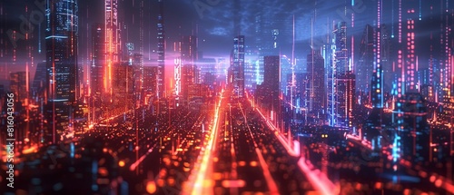 Naklejka premium Futuristic tech city at night, abstract background of high speed global data transfer and super fast broadband 8K , high-resolution, ultra HD,up32K HD