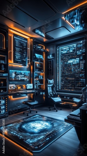 Obraz premium Futuristic Tech-Filled Office with Illuminated Interface