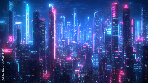 © Thiago, Obraz premium Futuristic tech hub with cybernetic augments, neon accents, and advanced ai.futuristic tech cityscape, neon, glossy, and metallic skyscrapers ai generated. Holographic City. Illustration
