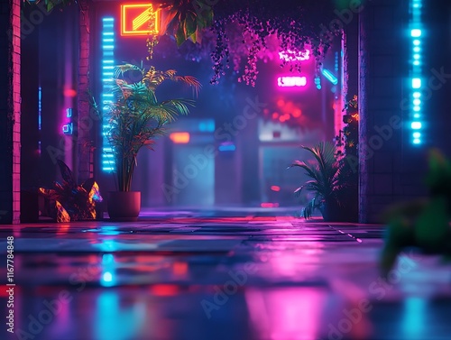 © Akash, Fototapeta premium Futuristic tech hub with vibrant neon lights and geometric shapes,