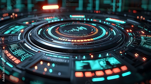 Obraz premium Futuristic tech interface, glowing circular console, dark background,...