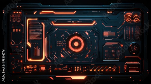 Obraz premium Futuristic tech interface with glowing orange elements on dark background.