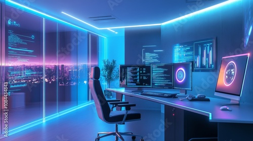 Fototapeta premium Futuristic Tech Office with Glowing Screens