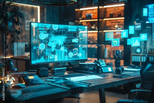 Naklejka premium Futuristic Tech Workspace Data Analytics, Global Network, Cybersecurity