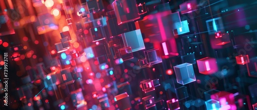 © Mickael, Obraz premium Futuristic technology abstract background with lines and cubes, big data, data center, server, internet, speed. Fantastic wallpaper abstract neon lights into digital technology. Generative ai