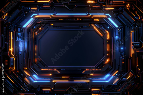 © Putu, Obraz premium Futuristic technology background, glowing neon orange and blue circuit board, abstract digital design, dark metallic frame, blank space for text or logo.