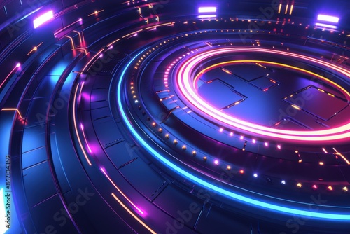© chesleatsz, Obraz premium Futuristic Technology Background. Neon Glowing Circle with Digital Interface