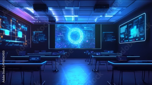 Fototapeta premium Futuristic Technology Classroom with Neon Lights and Data Visualization on...