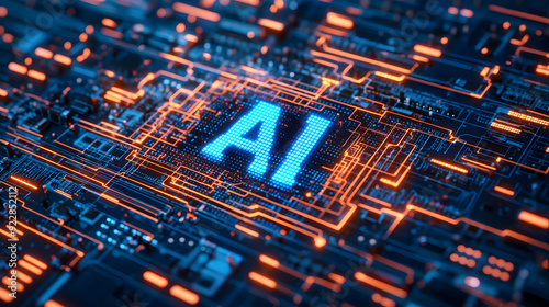 © Vicky, Obraz premium Futuristic technology computer circuit board neon electronic components abstract cyber design chips AI supercomputer semiconductor CPU GPU circuits interconnection connectivity computer processor unit