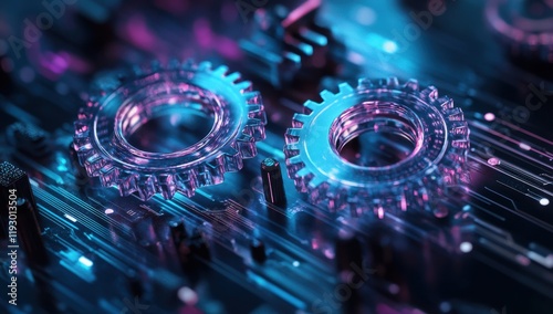 Fototapeta premium Futuristic Technology Concept with Glowing Gears and Circuit Board Design...
