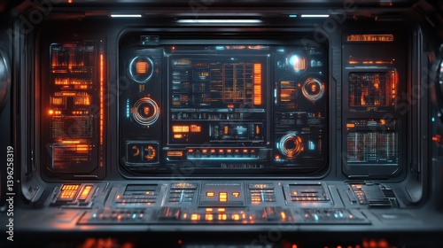 © Falih, Obraz premium Futuristic Technology Control Panel Interface with Orange and Blue Neon Lights