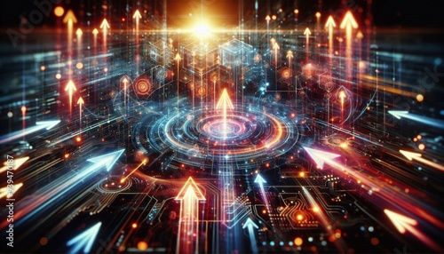 Obraz premium futuristic technology data visualization, glowing neon arrows and grids,...