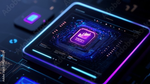 © MNFTs, Fototapeta premium Futuristic technology design showcasing a glowing microchip on a digital interface with vibrant neon colors.