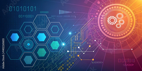 Obraz premium Futuristic Technology Interface with Binary Code, Hexagons, and Digital Gears