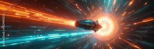 © Vadym, Fototapeta premium Futuristic time travel machine travels through space and time. Illustration shows a spaceship entering a portal tunnel with light speed effects. Sci-fi concept of the future with a vehicle.