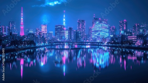 © SepazWorks, Fototapeta premium Futuristic Tokyo skyline with neon reflections Ultrеле