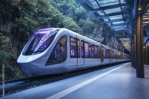 © Jamppidlaew, Naklejka premium Futuristic train at mountain station platform