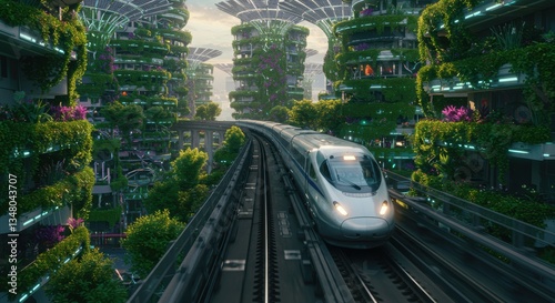 Fototapeta premium Futuristic train journey through sustainable green city with vertical gardens