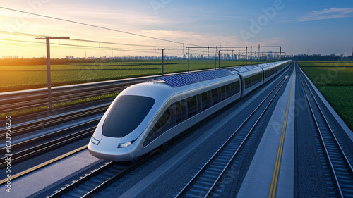 Fototapeta premium Futuristic train solar panel high speed railway countryside sunset eco friendly modern