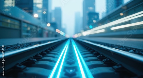 © Nutthanon, Fototapeta premium Futuristic train speeding on neon tracks urban cityscape dynamic view