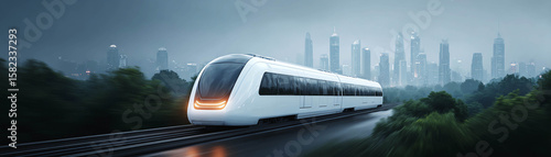 Naklejka premium Futuristic transport capsule high speed train modern city sleek design urban landscape misty morning innovation technology