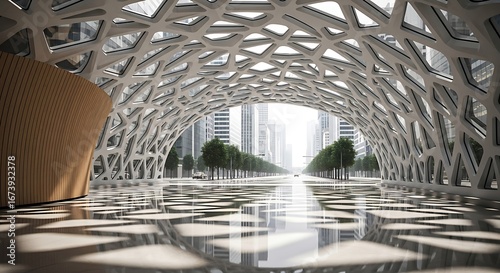 © Md_ratul, Obraz premium Futuristic Tunnel Architecture with Geometric Design and Cityscape Urban Structure