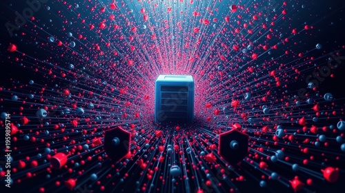Fototapeta premium Futuristic tunnel, glowing particles stream toward central server. Dark...
