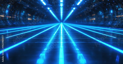 Fototapeta premium Futuristic tunnel glows brightly. Blue light streaks converge toward distant...