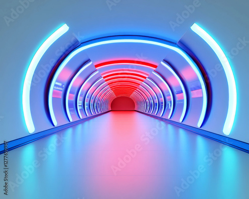 © Dadee, Naklejka premium Futuristic tunnel illuminated with vibrant neon lights.