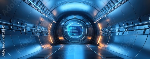 Obraz premium Futuristic Tunnel Interior with Advanced Technology and Blue Ambient Lighting...