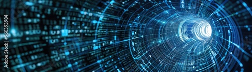 Fototapeta premium Futuristic tunnel with glowing blue lights and digital data streams, creating...