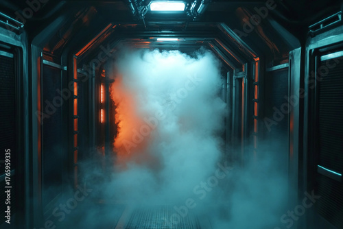 Fototapeta premium Futuristic tunnel with glowing blue lights and mysterious fog, atmospheric...