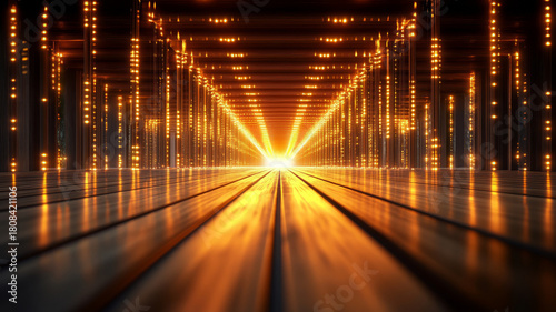© Panupan, Fototapeta premium Futuristic tunnel with glowing orange lights, metallic floor, and dramatic perspective