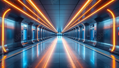 © Ana, Fototapeta premium Futuristic Tunnel with Neon Orange Lighting with Modern Design, and SciFi Interior.