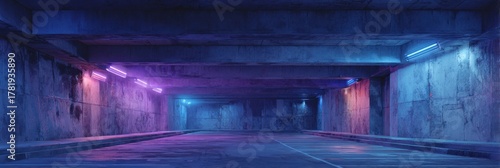 Fototapeta premium Futuristic Underground Concrete Archway: A Grunge Cyberpunk Setting with Vibrant Purple and Blue Neon Lights