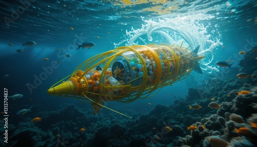Fototapeta premium Futuristic Underwater Exploration Vehicle Surrounded by Marine Life