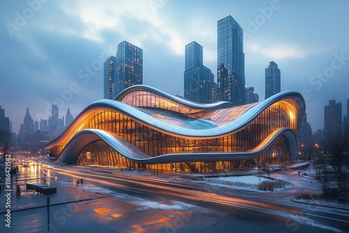 © julija, Fototapeta premium futuristic urban architecture with glass skyscrapers reflecting dramatic sky, creating dynamic patterns of light and movement in modern city