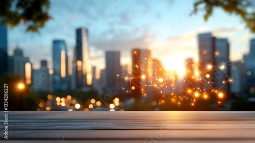 © Poonnoi, Fototapeta premium Futuristic urban center powered by ai downtown skyline digital art evening glow wide-angle view innovation and technology