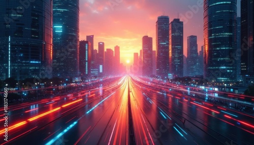 Fototapeta premium Futuristic urban cityscape at sunset with vibrant streaks of light