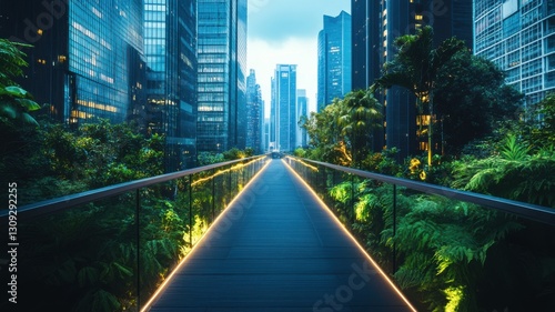 © cvetikmart, Fototapeta premium Futuristic urban jungle walkway with illuminated path in modern cityscape. 3D urban landscape