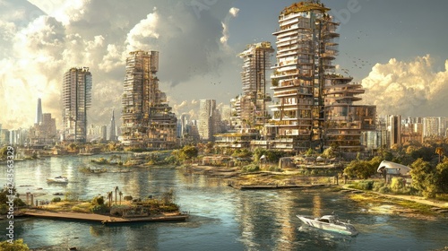 Obraz premium Futuristic Urban Landscape with Green Architecture and Waterways