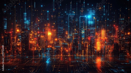 Fototapeta premium Futuristic Urban Landscape with Neon Lights and Digital Elements Displaying...