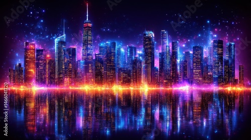© Artajar, Obraz premium Futuristic urban landscape with vibrant city lights reflecting i