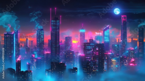 Fototapeta premium Futuristic urban landscape with vibrant neon illumination and night ambiance