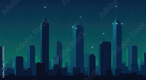 © IbragimovN, Fototapeta premium Futuristic urban skyline at night with illuminated skyscrapers and stars