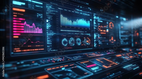 © Kunalai, Obraz premium Futuristic user interface displaying data analytics with vibrant colors and digital graphs, ideal for technology and data visualization themes.